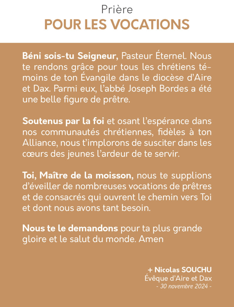 Le thème d’octobre portait sur « Le ministère sacerdotal de l’abbé Bordes ». Celui de novembre, précédait l’anniversaire de l’armistice, en évoquant « L’abbé Bordes – un prêtre dans la Grande Guerre ». Le thème suivant préparait le lancement, par Monseigneur Nicolas Souchu, de la prière diocésaine pour les vocations, en évoquant « La vocation sacerdotale de l’abbé Bordes ».
